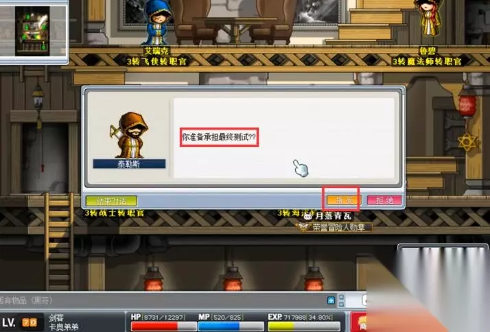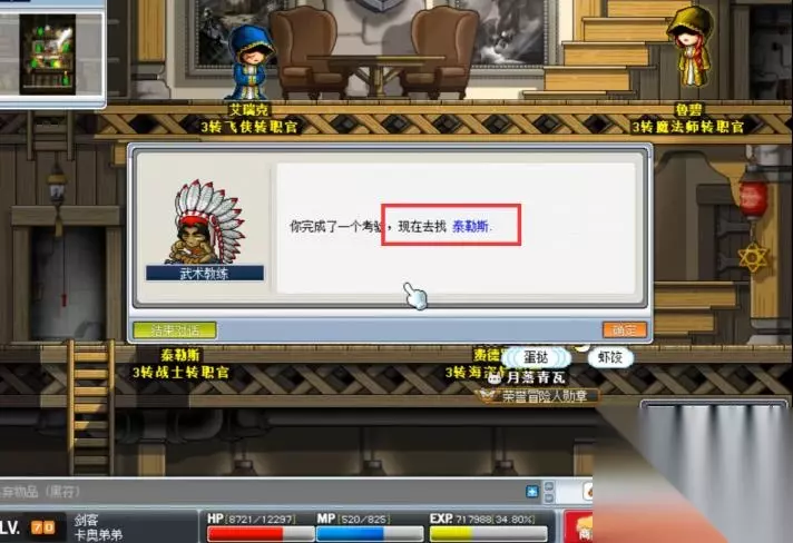 1、在冒险岛中,首先需要字啊神秘岛长老公馆找到3转战斗转职官泰勒斯。
