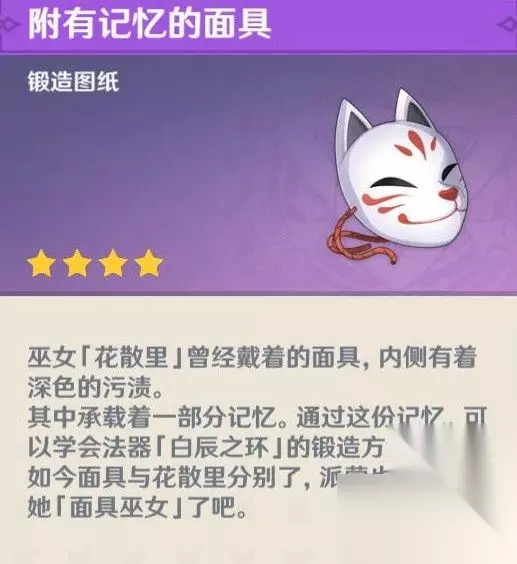 原神神樱大祓狐狸面具作用介绍 面具是用来解锁武器图纸和白辰之戒的,但是没有什么用。这东西只是有一些纪念意义和价值而已。很多人一开始以为这是一个装饰品,就拿来戴在角色的头上。完成所有任务将会给你一个“带有记忆的面具”。它是锻造图纸,使用后会被破坏。白尘之戒是一件附加威力的法宝。请自行决定是使用还是保留。