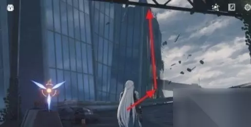 进入大楼废墟后,可以看到一个蓝色跳板,站在蓝色跳板上跳起,往左侧转头。