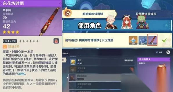 【食用指南】 1.活动共三个阶段,其一、其二、其三,都有一个活动任务。分别是活动第1、3、5天开启。 2.每个阶段包括2个「闲畅游艺」(可联机)和1个「破邪游艺」(单人)挑战。 3.「闲畅游艺」有乐玩和百练两个难度,每完成闲畅2关的乐玩难度,即可解锁破邪的挑战。 4.活动期间可以获得满精活动专属(绝版)武器「单手剑·东花坊时雨」,及原石等多种奖励! 活动任务:妖雾重重 奖励:30原石+2w摩拉+2本大经验书+4个精锻魔矿 扇子的位置: