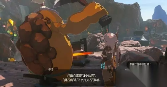 与正在打铁的伯洛杭对话接取【迷你挑战-鼓隆族之魂“碎岩巨剑”】,然后准备【劈石剑×1】、【钻石×3】、【打火石×5】,就可以直接造出碎岩巨剑(武器用坏了,也可以再进行锻造)。
