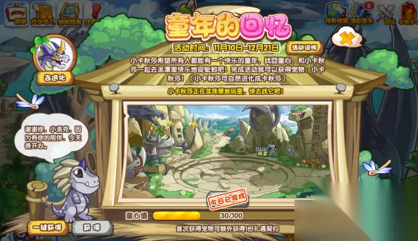 洛克王国小卡秋莎可以在童年的回忆活动中获得。 童年的记忆 活动时间:11月10日-12月21日 活动地图:龙之守望 活动获得:小喀秋莎、礼遇契约