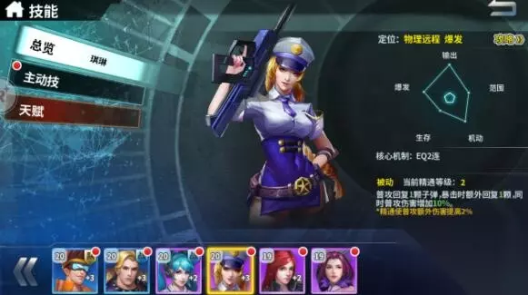 领教一下最美狙击手在超神学院终端机里的的激活技能吧。 穿云破(Q):穿透射击,发射一发可以穿透前方所有目标的子弹,初始造成180%物理伤害。 装弹(W):装弹,立刻获得2颗子弹。并在5s内增加5物理攻击力。 神龙摆尾(E):后跳射击,一次发射3发镭射弹,对前方目标初始总计造成260%伤害。 阿修罗之怒(R):琪琳跳至高空,对脚下位置发射一颗毁灭性子弹,初始总计造成1400%物理伤害。 琪琳是了不起的战士,拥有最普通的基因,但是在不知道琪琳位置的情况下,没有一个敌人的指挥官敢站出来指挥。拥有弑神能力的战神狙击手,她会告诉你她的枪口下只有命中。