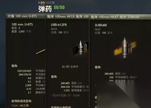一门除了单发低、备弹少之外没缺点的炮 140这个100炮是老朋友了,我们无需赘述它的细节数据。但是有几个点还是需要注意,首先它这个320的单发伤害确实是低了,但带来的是超高的DPM(顶配可以到接近4000),但是140工程射速太快,备弹又只有50发,在现在的“持久战”中有一点备弹焦虑。1535速的光速APCR和330穿的HEAT要怎么配比也很看玩家的取舍。
