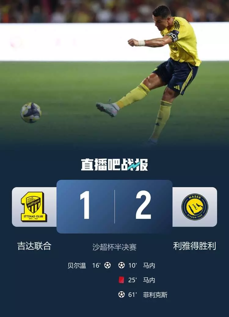 沙超杯-十人胜利2-1吉达联合 马内进球+直红C罗助攻菲利克斯破门