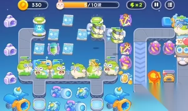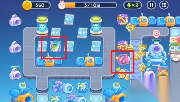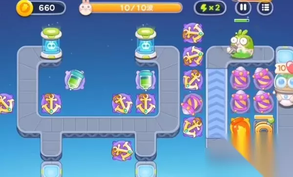 4、后期记得给电闸进行充能,并且在左侧位置根据需求来建设更多的船锚,在传送带右侧放置满火箭炮台,再根据萝卜币数量合理进行炮台的升级,就可以完美通关了。