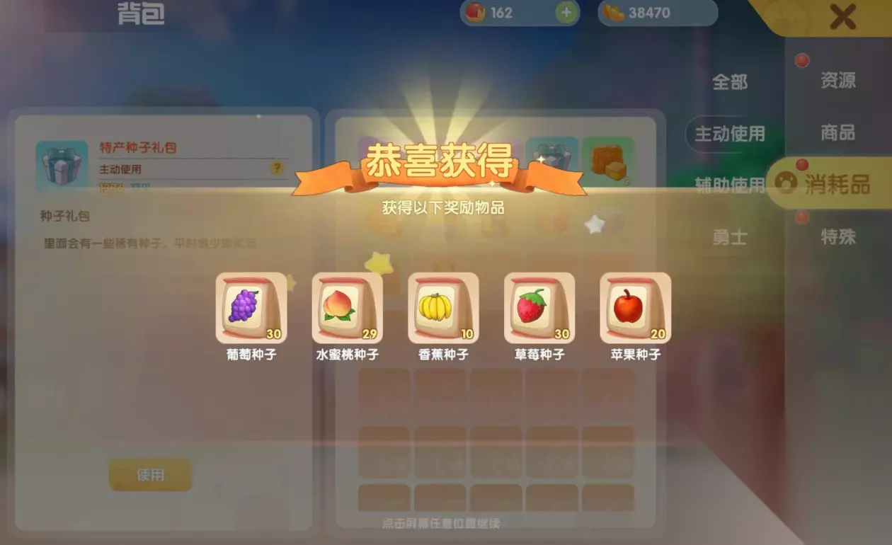 第七是去自家或者邻居家,找到梅森神秘商店即可换取。第八种是去浆果丛林或者牧场稻草堆,在里面摸索有几率摸到种子。第九种是参与派对,开派对主发的福袋有概率开出特产。此外种子还有一些一次性获取途径,也就是说仅可拿到一回。比如和NPC梅森亲密度达到一定范围,就能得到一次性的种子奖励。完成放飞心愿灯、捡垃圾或者神器密码任务后,也可得到。每月签到还有活动签到,也能一次性得到数量不固定的种子。