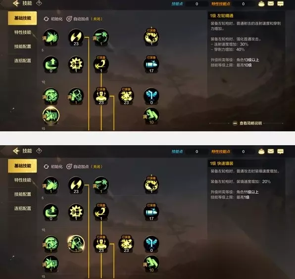 一、技能加点 1、被动技能 物理暴击、三重控制、花式枪术、快速拔枪、浮空劫击、枪之印记点满。 浮空劫击技能伤害不高拥有击飞效果但是同时自身也会飞起来,如果实战连招涉及回旋踢可以不学习该技能,避免影响连招手感。 2、BUFF技能 左轮暴击、银弹点满。 3、主动技能 【点满级】:刺踢、回旋踢、乱射、溃灭射击、溃灭回击、心灵反击、突袭强踢、横扫御敌、三连发、移动射击、多重射击、双鹰回旋、疯狂射击。 【点一级】:炙烤、浮空弹 炙烤能够强制抓取霸体怪物,方便浮空连招同时释放过程是无敌状态,能够在紧要关头自保躲避本来无法躲避的技能。浮空弹本身没有太大用处,但是它是多个技能的前置技能,所以点1即可。 4、特性技能 推荐升级多重射击、移动射击,技能伤害很高的同时冷却时间只有双鹰回旋的一半。 二、装备推荐 1、武器推荐:左轮枪 漫游转职之后会获得左轮精通和快速填装技能,在装备左轮枪时能够获得强化效果,同时25级之后能够学习的增益技能“左轮暴击”也能够在一定时间内提高左轮枪的暴击伤害。
