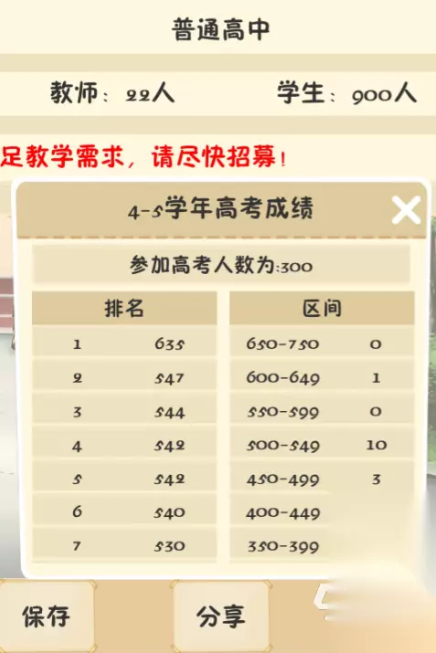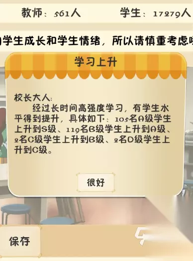 三、学生状态 可以多多增加平时的作业来提升学生的成绩,但是周末是否上课还是要根据他们的情绪来决定的,如果情绪上超过300这个值就会有事件发生比较麻烦,所以学生的情绪尽量将其控制在300以内,这里还有个小诀窍就是学生的情绪和成绩是挂钩的,但是如果不进行补课又会影响学生成绩,所以大家可以在高考后来开一些课余获得,而且游玩到后期,因为学校建筑全部是最高级的,所以每个学期一开始学生的情绪就会归零,就算从头补刀尾的课也不会有事件发生的。