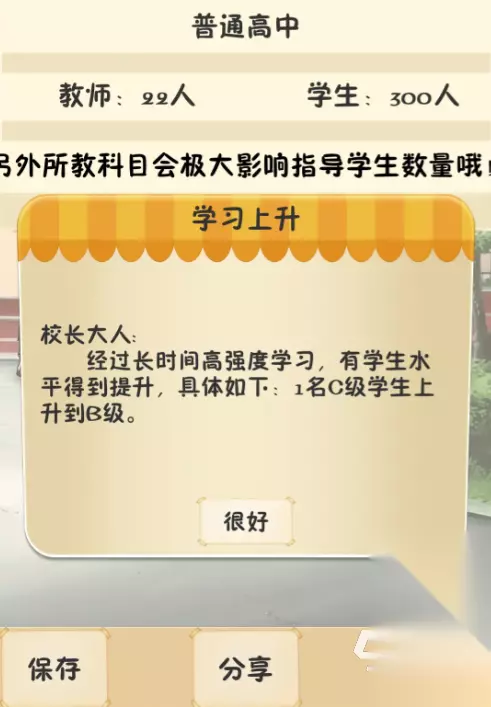 五、学生成绩增长 在游戏中学生成绩是否有增长,是至关重要的,现在看来影响的条件是有以下几点的,第一点就是有没有给学生加作业,有没有给学生进行补课,第二点是学校的建筑够不够学生们使用,第三点击就是老师的数量够不够用,同时老师的等级够不够高,第四点就是学生的状态,这个注意好观察就可以了,只要做好上面几点学生的成绩都是会稳定增长的。 六、推荐走向 这个毕竟推荐的玩法是里用最高的配置,再加上最高的宣传去收取费用,建筑方面大家在第一年的时候可以先造一个小的建筑,如果没有把握的话可以到六月底的时候再进行建造,如果有亏损的话,因为六月底会有赞助可以弥补起来不会造成破产的情况,再把暑假个熬过去的话,就又可以到下一个学年。