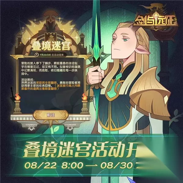 t15_2-t15_1:6.0 标签: 迷宫 剑与远征叠境迷宫活动介绍。剑与远征叠境迷宫活动开始了,在这次活动又会有什么奖励呢,下面寒山就给大家介绍一下,一起来看看吧。 剑与远征叠境迷宫活动介绍 活动时间 2020年8月22日8:00—2020年8月30日7:59 活动内容 活动期间,异界迷宫的奖励将全部翻倍。(迷宫旅行商人内除装备外的道具出售数量翻倍)