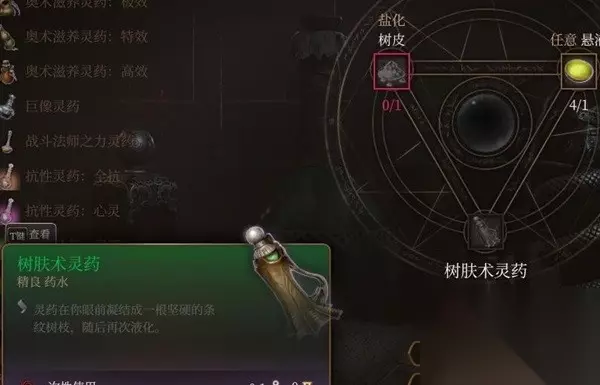 文章内容导航 树肤术灵药 护甲提到16 前期后排护甲低时喝了蛮好用的,到了后期穿上甲了就完全没有用了,拿到就创造喝了吧,材料除了买就是和泥魔蝠一块的树人掉落。