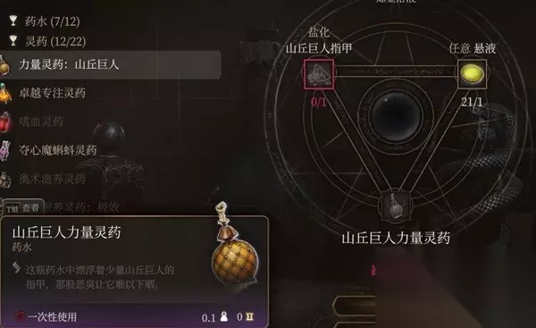 文章内容导航 山丘巨人力量灵药 将你的力量提升至21 非常朴实实用的灵药 材料山丘巨人的脚趾,在游戏中没有野生山丘巨人所以只能靠商店购买成品或者材料。