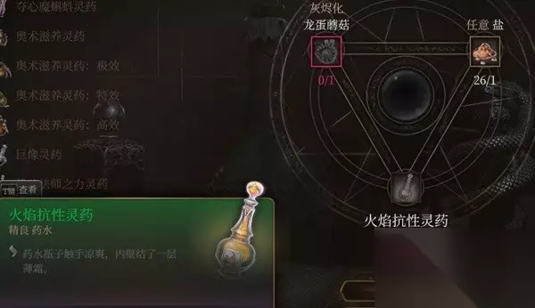 文章内容导航 火焰抗性灵药 火焰伤害是游戏里最多的因此很实用,材料龙蛋蘑菇很多角角落落都能找到所以多按alt走路吧。