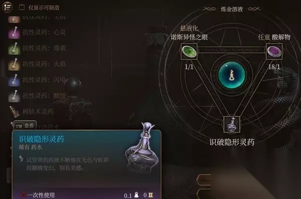 文章内容导航 识破隐身灵药 喝了后获得破隐能力(生物需要过检定)没啥大用可以看一些隐藏的机关之类的,最大的用处是救画家喝一个清幽灵,材料诺斯异怪之眼只能买。