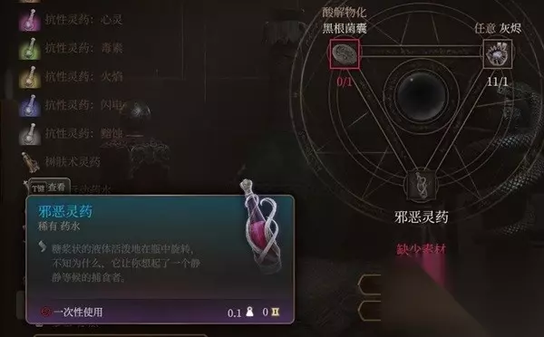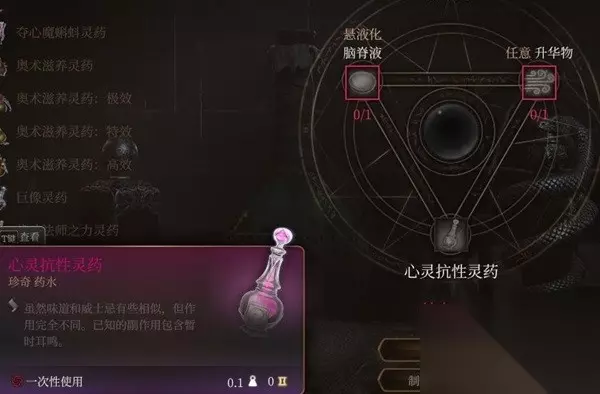 文章内容导航 心灵抗性灵药 虽然是夺心魔主题但实际上没多少精神相关的内容,用处基本没有配不上这个稀有度,材料打那个脑子怪就能摸一大堆一点也不稀罕。