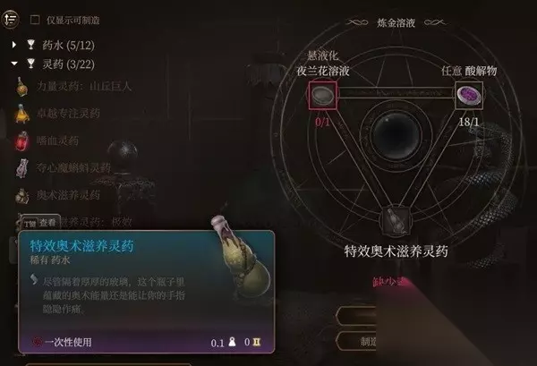 文章内容导航 特效奥术滋养灵药 给个三环法术位没了,材料夜兰花很稀有 野外只有第二章大地图有零散稀少分布,但在第三章哀伤之邸地下的军需库右边影心曾经的回忆点有很多,第二章的花建议拿来攻略影心。