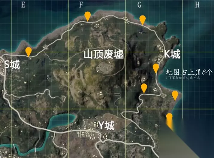 位置四:山顶废墟附近:包括S城、Y城、K城(8个)