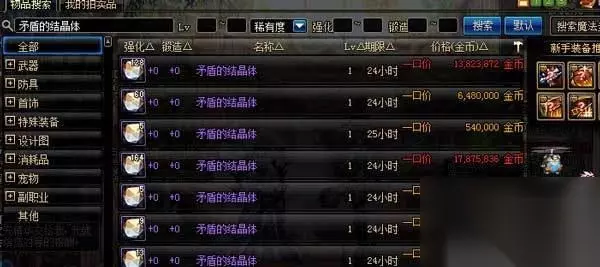 2、拍卖行购买 拍卖行中也会有玩家上架矛盾的结晶体,直接购买就可以了.购买的矛盾的结晶体会通过邮件发送给玩家;