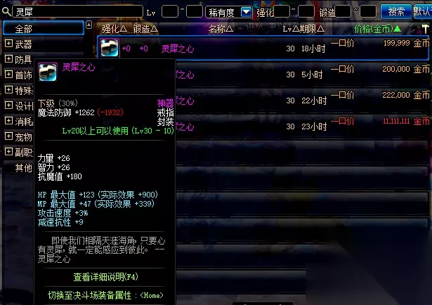 30级神器戒指,灵犀之心,灵犀之心唯一亮点是3%攻速加成。灵犀之心在当时流传这一句话:3%的攻击速度,能让一切不可能的连招变成可能。因此灵犀之心的价格直逼骨戒,现在版本更新属性大洗牌,骨戒依旧能卖好几千万,灵犀之心则沦为白菜价。