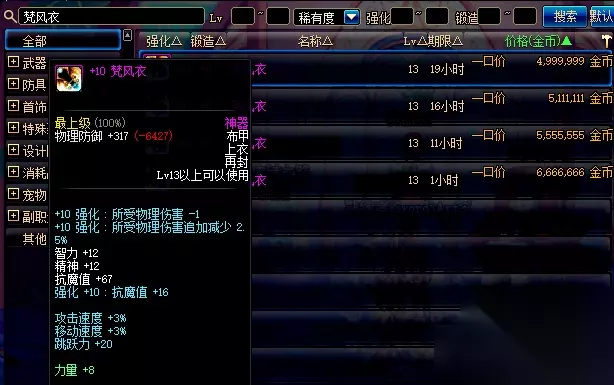 13级神器上衣,梵风衣,攻速和移速+3%,跳跃力+20,能掀起一场腥风血雨的装备。俗话说天下武功唯快不破,当你的攻击速度、移动速度比对手高出一个档次时,在近身肉搏或者各种 *** 走位的时候可以占尽先机。梵风衣贵的原因不仅仅是属性,还有它是一件上衣部位,只是价格贵的让人怀疑它可以防封。 通过以上的介绍,您现在对《地下城与勇士》60版本中一些经典装备有了更深入的了解。这些装备在当时的游戏版本中具有重要地位,对玩家的战斗能力和游戏体验产生了显著影响。它们不仅代表了游戏的一个时代,也成为了许多玩家珍贵的回忆。在《地下城与勇士》的世界里,装备的选择和使用是取得胜利的关键。现在,就让我们继续在这个充满挑战和冒险的世界中,寻找属于自己的传奇装备,书写属于我们自己的冒险故事吧!