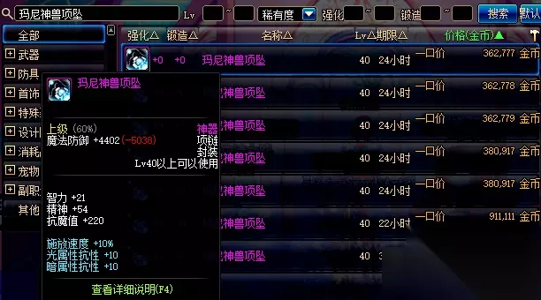 40级神器项链,玛尼神兽项坠,10%施放速度。在决斗场中不是所有职业都追求攻速的,像一刀哥鬼泣职业更追求施放速度,因此能加10%施放速度的玛尼神兽项坠自然价值不菲,在早期的DNF玛尼神兽的价格也是比骨戒贵的。