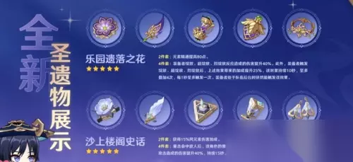『乐园遗落之花』 二件套效果:增加80点元素精通 四件套效果:装备该圣遗物的角色对于『绽放』系列反应的伤害提升50%,若触发『绽放』反应,则上述效果额外+25%,最多叠加4次,持续10秒,角色处于后台依旧可触发该效果 『沙上楼阁史话』 二件套效果:增加15%风元素伤害 四件套效果:重击命中敌人后,攻击速度+10%,普通攻击,重击,下落攻击伤害+30%,持续10秒 小结:感觉第一套圣遗物妥妥能加强妮露,第二套圣遗物就是散兵的专属圣遗物了。 三、其他汇总