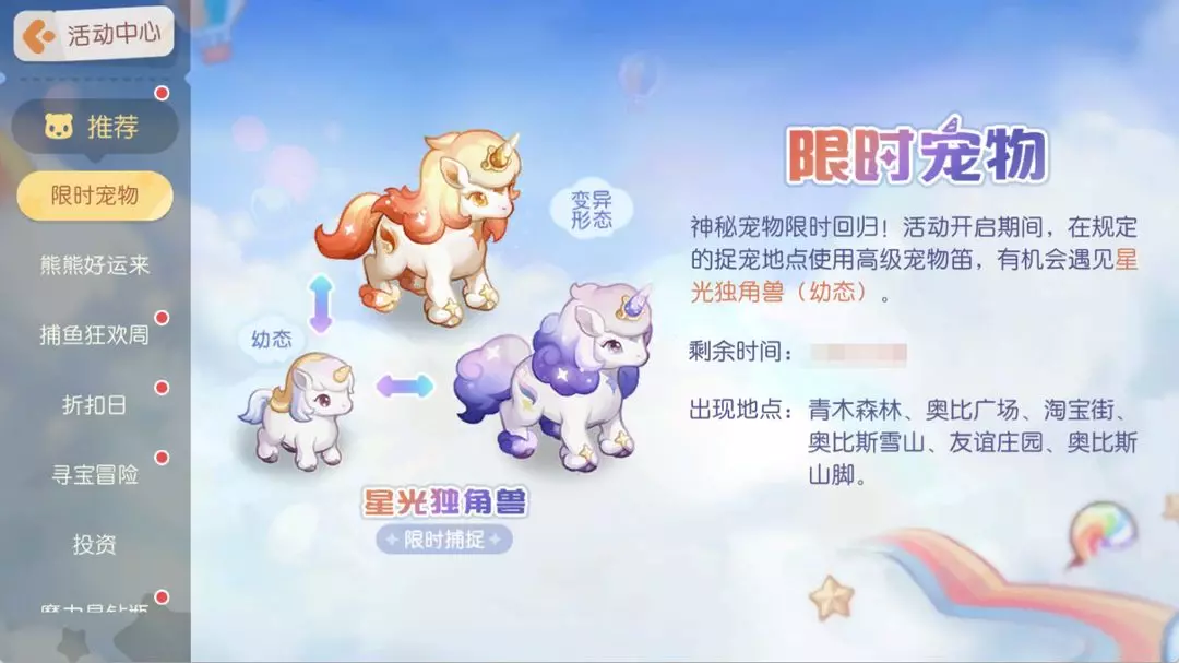 活动介绍:神秘宠物限时回归!活动期间限定宠物「星光独角兽(幼态)」将会出现在奥比岛。前往岛内捉宠地点,使用高级宠物笛就有机会和它相遇哦