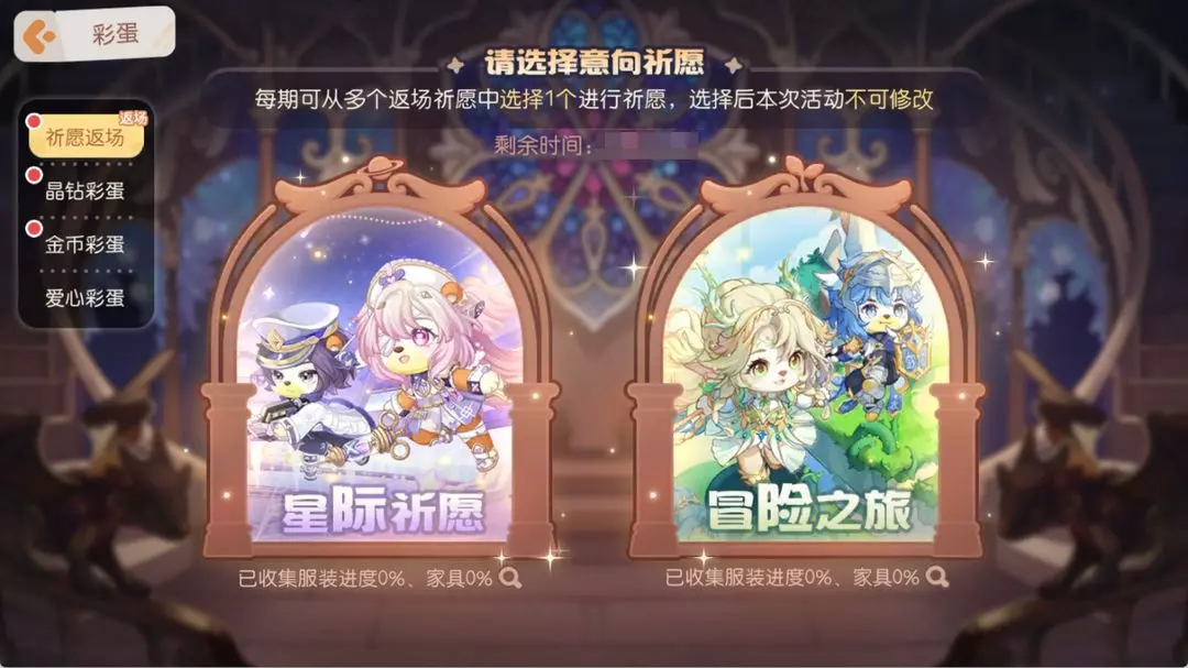 2、本次复刻彩蛋「星际祈愿」或「冒险之旅」将不继承首次开启时的抽取次数进度,即获得典藏的概率为70%,晨星概率为30%。抽取可获得对应积分,积分可在兑换商店内兑换物品,活动结束后剩余兑换积分折算成金币。