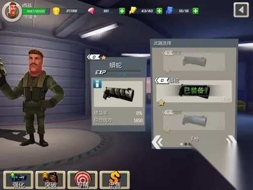 2. 武器的装备与出售 采用点击式装备方法,在武器库界面内点击即可装备所选武器,无需在进行其他操作。 选择武器后点击出售按钮,即可售出所选武器(已装备的武器无法出售)
