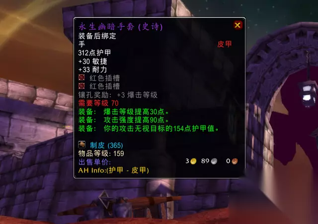 永生幽暗手套介绍 永生幽暗手套是制皮专业制作的皮甲手套。 永生幽暗手套拥有30敏捷、33暴击、154破甲和90攻强,以及两个红孔。