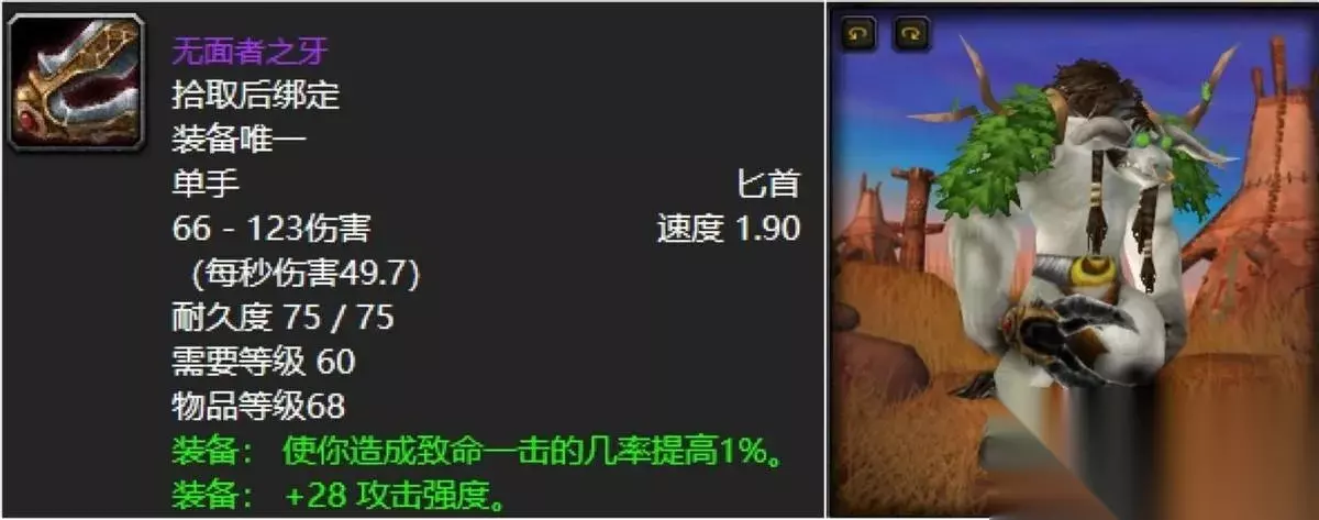 有一说一,远古时期这把大剑辛洛斯的话还是有着诸多的大师级武器战扛着的,美其名曰“小兄弟会之剑”,其实力可见一斑。但是怀旧服来看,狂暴战的地位真真是毁天灭地的水准,也是让武器战彻底隐秘了踪迹,这东西也基本上是100金币谁要谁抬走的,实不相瞒,喵叔的战士魄甲就有幸收藏了一般,就待国服重开再拿上去帅气一会了。 九:无面者之牙