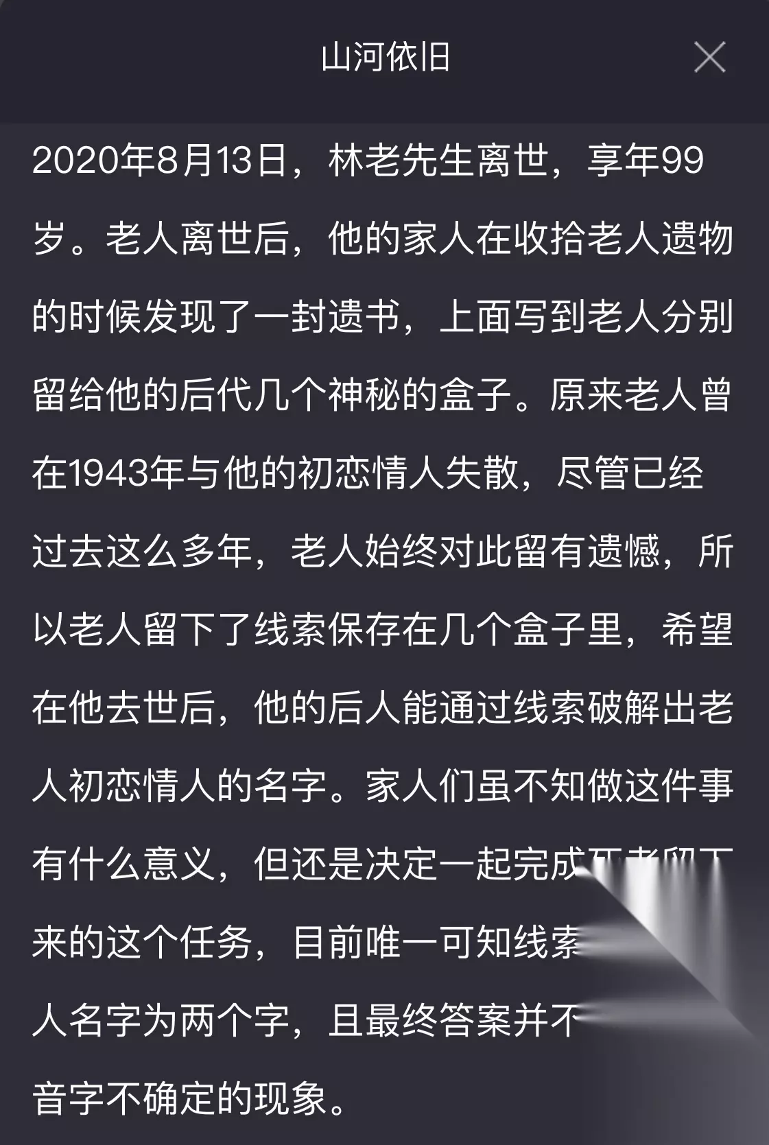 摩斯密码对照后,是一串数字:2685721195546。我也问了几个侦探朋友,今天一起琢磨这个案子。有新进展,我会更新在文章下面。 下午1点30分进度更新:摩斯密码破译成中文是“茺”,林老先生孙子的名字是他取的,孙子叫林慕银。所以,恋人的名字里可能也有“银”字,茺银或银茺都有可能。(破译还没完) 案件中的线索解读1. 摩斯密码是关键2. 数字对应字母3. 名字里带银字 可能的答案1. 茺银2. 银茺3. 其他组合 往期案件推荐诡异的绑架案尘封的往事荒诞的人生消失的蓝宝石时代的悲剧(上)时代的悲剧(下)富豪的遗产万恶之源 总结 这次案件让我们这些侦探玩家又学到了点东西,密码破译虽然难,但也不是完全没头绪。游戏设计得挺有意思,每次都有新挑战。希望下次还能一起解谜,看看能不能找到更好的方法。总之,这个案件挺有挑战性的,我们得继续努力。