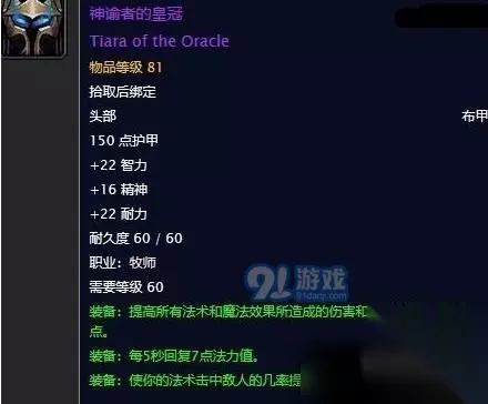 魔兽世界怀旧服神谕者的皇冠任务攻略 等级要求:60 任务类型:地下城 所属地区:安其拉 任务开始:安多葛斯 任务结束:安多葛斯 相关职业:牧师 任务前提:诺兹多姆的子嗣声望达到友善 任务需求:把维克尼拉斯的头饰、2个先知塑像、5个银质甲虫和5个白骨甲虫交给安其拉的安多葛斯。 【维克尼拉斯的头饰】击杀安其拉副本BOSS维克尼拉斯大帝100%掉落,【先知塑像】击杀安其拉副本中的精英怪有极小的概率掉落,【银质甲虫】和【白骨甲虫】击杀安其拉和安其拉废墟中的精英怪有80%的概率掉落,安多葛斯在副本安其拉中打完老1的角落里。 任务奖励:神谕者的皇冠,经验9950XP(满级可获得59银70铜),+250诺兹多姆的子嗣声望。 神谕者的皇冠效果一览