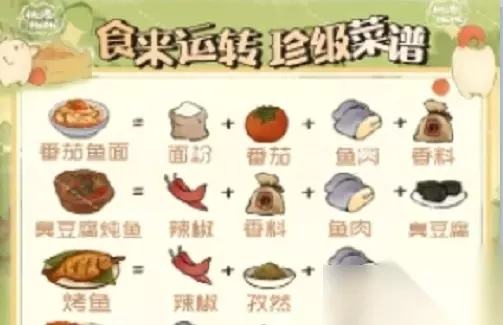 桃源深处有人家时来运转菜谱配方攻略 1、普 白粥:水稻 清蒸鱼:鱼肉 云水面:面粉 蒸鸡蛋:鸡蛋 虎皮辣椒:辣椒 2、良 麻花:糖,面粉 蒸槐花:面粉,槐花 鸡蛋饼:鸡蛋,面粉 卤牛肉:牛肉,香料包 辣炒年糕:水稻,辣椒 槐花鸡蛋:槐花,鸡蛋 牛肉蒸蛋:鸡蛋,牛肉 香辣鱼块:鱼肉,辣椒 烤牛肉串:牛肉,孜然 鸡蛋煎年糕:水稻,鸡蛋 水煮牛肉丸:牛肉,面粉 番茄炒鸡蛋:番茄,鸡蛋 辣椒炒鸡蛋:辣椒,鸡蛋 孜然烤臭豆腐:孜然,臭豆腐 3、妙 炒牛柳:糖,辣椒,牛肉 槐花饼:槐花,鸡蛋,面粉 番茄鱼:番茄,鱼肉,香料包 牛肉面:牛肉,面粉,香料包 松鼠鳜鱼:糖,醋,鱼肉 九转大肠:糖,肥肠,香料包 红烧牛肉:糖,牛肉,香料包 干煸肥肠:肥肠,辣椒,香料包 脆皮肥肠:肥肠,面粉,香料包 番茄肥牛:番茄,牛肉,香料包 糖醋荷包蛋:糖,醋,鸡蛋 番茄鸡蛋面:番茄,鸡蛋,面粉 孜然烤年糕:水稻,孜然,辣椒 番茄年糕汤:番茄,水稻,鸡蛋 红烧臭豆腐:糖,水稻,臭豆腐 臭豆腐炒蛋:鸡蛋,辣椒,臭豆腐 肉末臭豆腐:辣椒,牛肉,臭豆腐 臭豆腐炒年糕:水稻,辣椒,臭豆腐 4、珍 烤鱼:鱼肉,辣椒,孜然,香料包 红烧鱼:糖,醋,鱼肉,香料包 牛肉汤:醋,牛肉,辣椒,香料包 牛肉饼:牛肉,面粉,鸡蛋,香料包 番茄鱼面:番茄,鱼肉,面粉,香料包 糖醋臭豆腐:糖,醋,辣椒,臭豆腐 番茄炖牛腩:糖,番茄,牛肉,香料包 番茄牛肉面:番茄,牛肉,面粉,香料包 臭豆腐炖鱼:鱼肉,辣椒,臭豆腐,香料包 臭豆腐肥肠煲:糖,辣椒,肥肠,臭豆腐 关键字: 桃源深处有人家