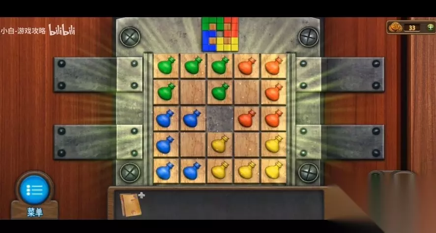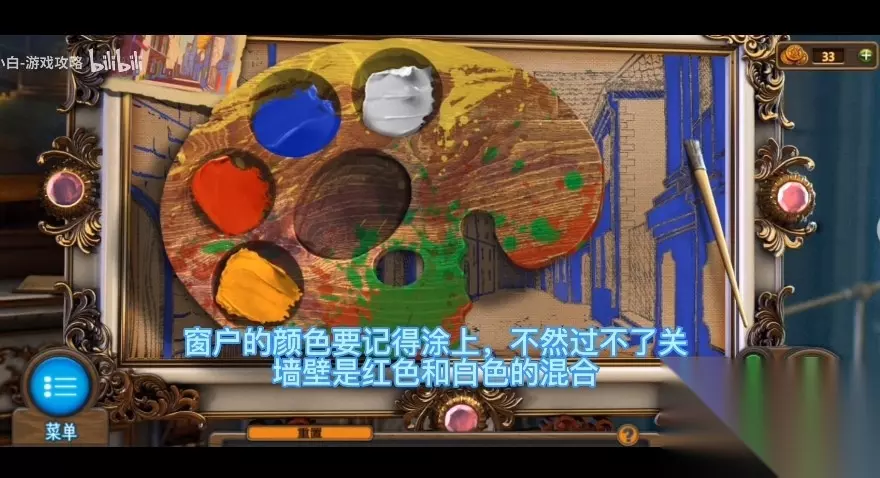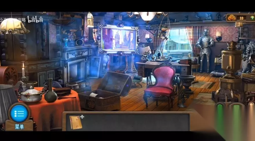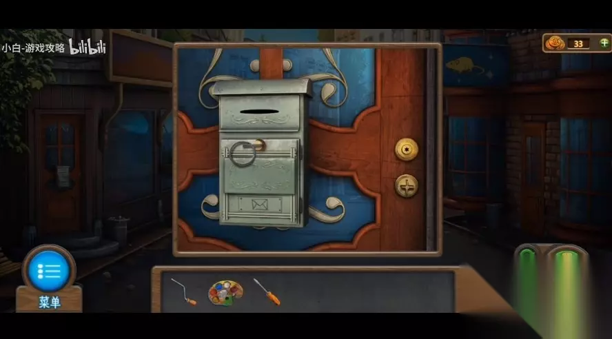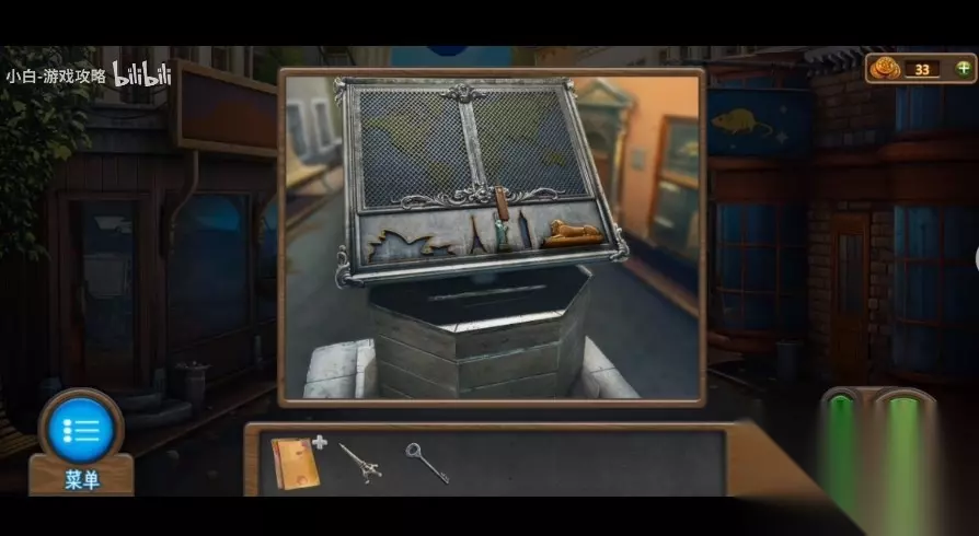 227、应用钥匙开启左侧门边的小锁,进行内嵌游戏 (游戏难度不高,将除红色方块外的其他物件尽量所有挪到左侧,红色方块移到右侧,然后往下沉,随后别的物件往红色方块上边挪动,直至红色方块可以出来)。 228、开启门边的小方盒,得到【神密的信】,【埃菲尔铁塔】和【报刊】,将手柄立即安装于门边。 229、将【报刊】放到缝隙下,应用【螺丝刀】将门锁处钥匙桶下来,抽出报刊得到【钥匙】。 230、将钥匙插到门边,进行开锁游戏(小游戏难度不高,可以试着每向右挪动一步,数次转动下方转轴,一步步向右挪动,直至每根立柱中间横线与所里的横线一致才行),点击把手,进到古董店。 231、查询左边的餐桌,移走前面的脏物,获得后边的【大狮身人面像】。 232、查询左边的火炉,在火炉外得到【拨火棍】,应用【拨火棍】掀开火炉里的火炭。 233、查询火炉上方奖牌,将中间奖牌放翻得到【火柴】。 234、将物品栏里的调色盘放到画板上,从屋顶吊着的布娃娃头顶得到【扩音器】。 235、查询右侧的酒箱,应用【螺丝刀】取出酒箱里的【闸阀】,并获取右侧桌子上的【茶壶】。