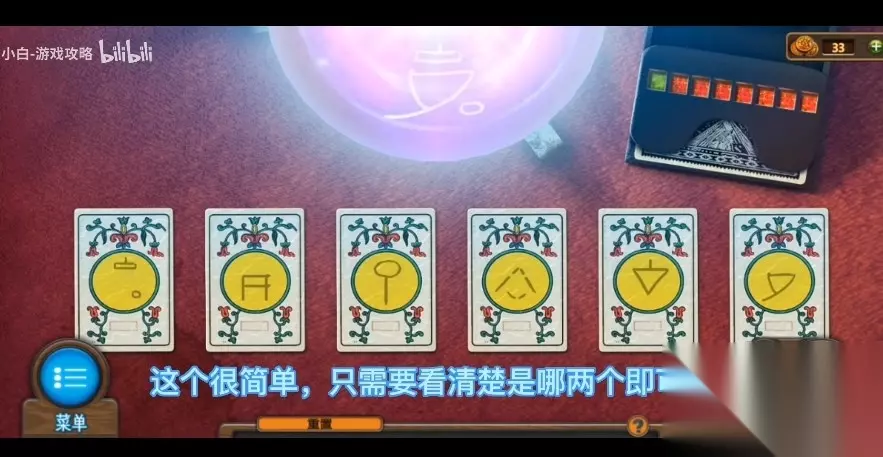 248、在木柜中获取【拉米结晶2】和【药液】。 249、将【花瓣出芽】种植在左前方桌子上的花盆内,应用【药液】灌溉,获得桌子上的【法术花】和【纸张】。 250、打开正前的纱帘,将【法术花】放到花架上,进行数学小游戏(任意游戏,难度任意),把开架子里的暗格得到【拉米结晶3】。 251、探寻第9章游戏内每一个老鼠图案,找到红色、黄色、蓝色老鼠图案的总数各几个,在左上方桌子上的铁笼密码中输入对应的数据(老鼠图案的数量和部位具有一定的偶然性,需要大家自身细心探寻,攻略中常用的密码为453),开启铁笼得到【小耗子】。 252、回到古董店,将小耗子来养猫咪得到【水晶球】。 253、回到街道右侧的屋子,查询右侧铺着红布的餐桌,将水晶球放到桌子上的架子中,进行拼图小游戏(游戏的难度较低,依据水晶球里的图案寻找下边牌组中可以组成这一花纹的两张牌,直至照亮出牌器里的8个灯)。 254、完成游戏后,在出牌器中得到【悉尼歌剧院】,应用【纸张】印在水晶球上得到【景观】。 255、回到街道,将【埃菲尔铁塔】【大狮身人面像】【自由女神像】【大笨钟】【悉尼歌剧院】放进街道正前的墓碑凹槽中,如图255、1把它放到地图中对应的部位,开启下边的机关得到【画笔】和【拉米水晶4】。