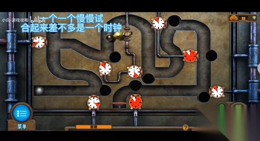 236、查询正前的办公桌,在办公桌上,将前边音乐盒的盖子盖紧,拿走后边的【灯】,并用【火柴】照亮。 237、摆脱古董店,赶到外边的街道上,应用【拔火棍】开启前面的下水道,将【灯】挂上去,获得管路里的【自由女神像】。 238、点击下水道底端,将阀门安装上来,完成游戏。 (游戏中一共有8个表盘,每个表盘中白色的部分代表了没有蒸气,红色部分代表喷涌蒸气,通过控制表盘上红色部分位置,调节喷涌蒸气的时间,从而使左边的铁球顺利地躲避黑洞,到达终点)。
