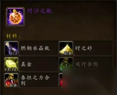 1、这个罐子需要我们达到450级考古学,然后去奥丹姆考古,就有几率获得。 2、开出来之后,我们就可以制作时沙之瓶了,需要1个燃钢水晶瓶、8个时之砂、12个真金、8个风行合剂、8个泰坦之力合剂、8个深石之油。