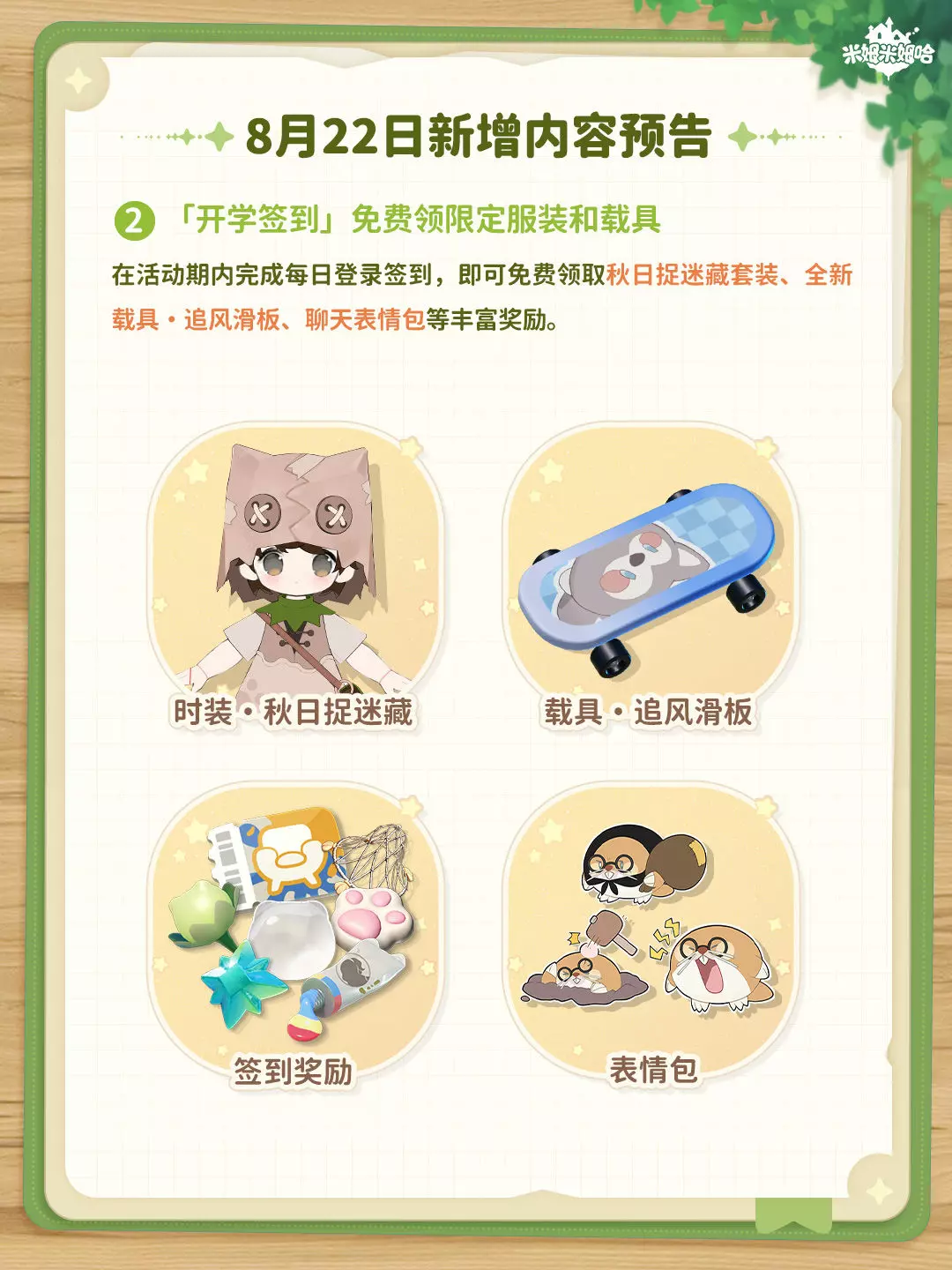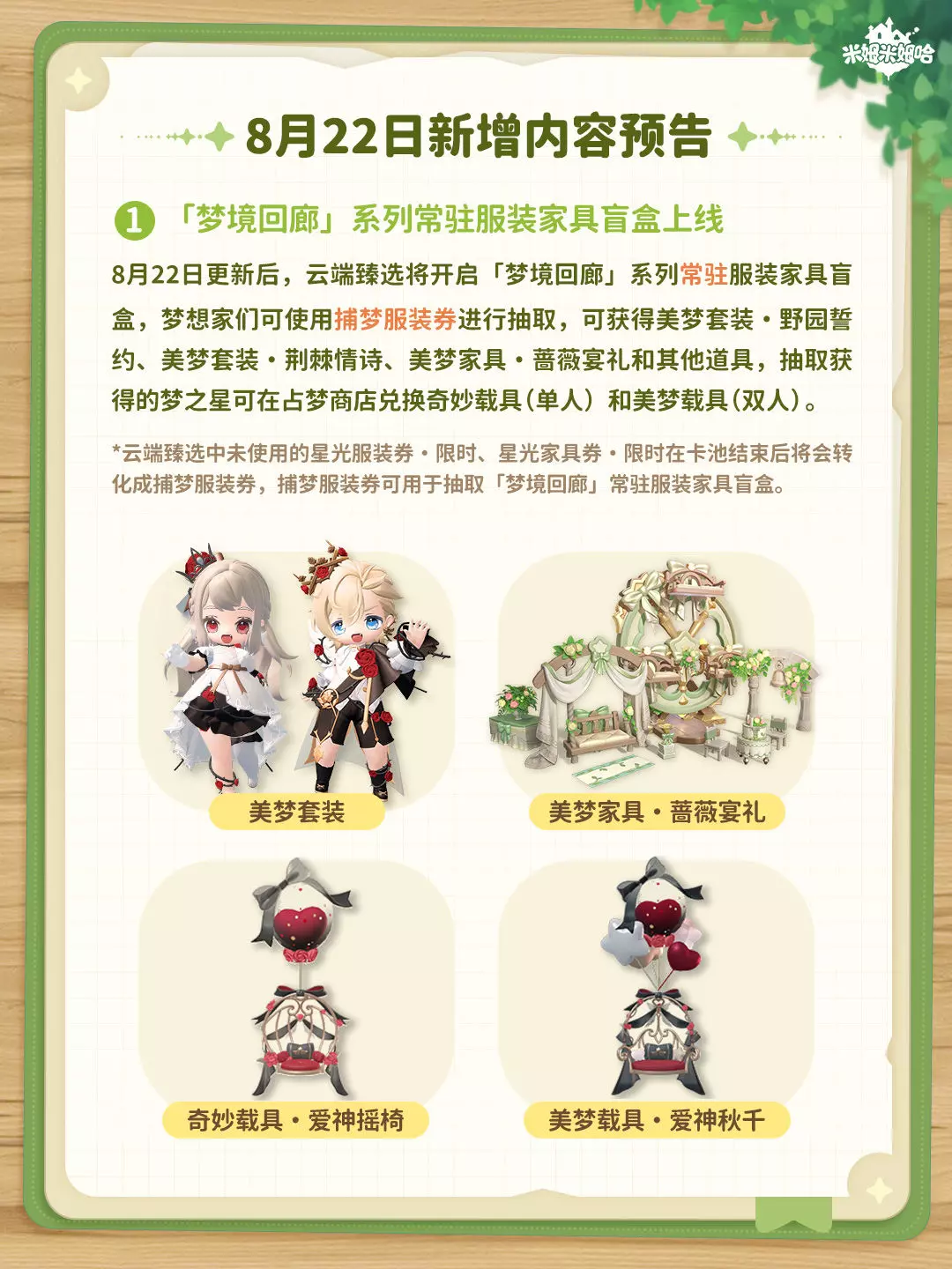 4.8月22日将开启【梦境回廊】常驻服装家具臻选盲盒和【开学签到】限定活动,全新服装&家具、免费载具、还有诸多签到好礼,千万不要错过哦!