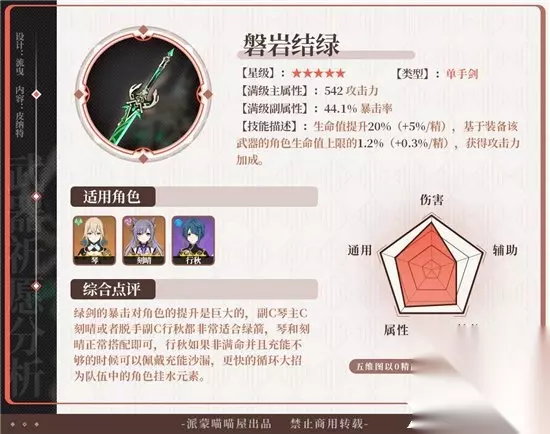 《原神》绿剑就业攻略 武器属性总结: 上限很高的一把武器,单手剑非主流主C可以使用,增加生命值再基于生命值提升攻击力,44.