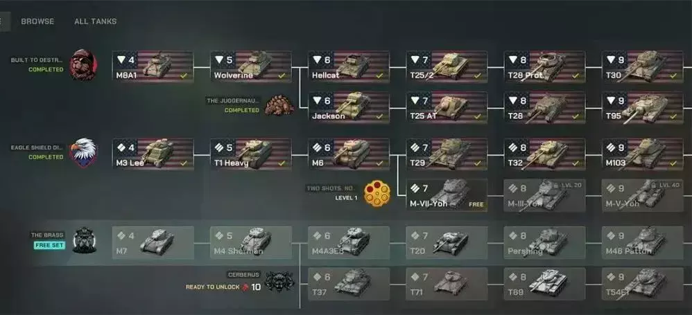🌲 经典的树形布局:套组界面将使用类似于经典科技树的分支结构展示坦克。