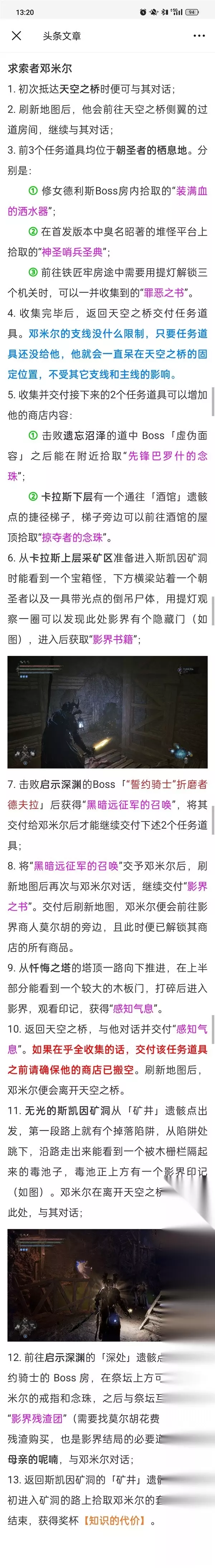 忠诚派队长斯托蒙德 1.初次抵达天空之桥时便可与其对话; 2.当玩家抵达卡拉斯上层后(或者你在此之前就从他这购买了“朝圣者的栖息地钥匙”并抵达了神圣修士的庄园),斯托蒙德便会离开天空之桥,并将“朝圣者的栖息地钥匙”以及“钟型高地地图”留给玩家。 3.在神圣修士的庄园拾取第一面“受损的旗帜”。位置需要从一个庭院进去(这个庭院有三扇门,其中两扇需要院长的钥匙),这个庭院还守着2个纯白之刃和1个虚伪面容,虚伪面容旁有个被砖块和木条半封着的门(如图),提灯进入,再通过电梯下去抵达酒窖后便能一路找到旗帜。 4.再次见面的位置在神圣修女修道院的门口,打开大门与其对话即可; 5.之后在神圣修女修道院的红树庭院二楼(庭院内有一堆朝圣者忏悔者和一只神圣回声)与其对话,并将“受损的旗帜”交给他,再次与其对话。此时便已解锁他商店的所有商品,如果在乎全收集的话,可以此时搬空他的商店。 6.在击败神圣修女修道院的Boss「狂喜的黄昏女猎手」后,从Boss房二楼出去来到一处平台,进入影界并在平台尽头的亭子内获取一个圣洁精华之后,折返会发现刷新了一只修道院院长(会射激光炮的那种精英),击败后拾取“破烂的旗帜”; 7.返回红树庭院二楼与斯托蒙德对话并交出“破烂的旗帜”,如果在乎全收集的话,交付该任务道具之前请确保他的商店已搬空。再次与其对话,刷新地图后他便会离开此处。 8.进入最高天后,可以在教堂门口的阶梯旁看到斯托蒙德的尸体,拾取他的套装后,支线结束,获得奖杯【忠诚】。 *斯托蒙德的两个跟班基本没剧情,初次见面时对话一次,队长离开天空之桥后再对话一次(两次对话也只是为了获取信息,不对话也无所谓),队长死后可以在神圣修女修道院门口发现这两位的尸体(也就是步骤4中队长所在的位置)。钢铁行者 *钢铁行者的支线结局与主线的影界结局绑定,并与达玛罗斯的支线冲突。 1.初次见面的位置在废弃的红树林的「村庄」遗骸点旁边,与其对话; 2.第二次的位置在皮耶塔Boss战前的影界花床旁边,与其对话,此处也是影界花床的教学。 3.第三次遇到的位置在遗忘沼泽中段,进入影界前往道中Boss「虚伪面容」的路上,朝右下方看就能找到他; 4.第四次遇到的位置在卡拉斯下层的「酒馆」遗骸点之前的拱桥旁边; 5.第五和第六次遇到的位置均在卡拉斯上层且都在主干道上,很难错过。但在对话完第五次之后,需要退出重进一次,继续推进直到接近通往天空之桥的捷径门时,与其第六次对话。这两次对话都请把他身旁的影界印记一起看了,才能顺利推动支线; 6.第七次遇到的位置在神圣修士的庄园的「通道」遗骸点旁边,与其对话; 7.如果此前的支线步骤都正常触发,那在进入神圣修女修道院Boss战「狂喜的黄昏女猎手」时,钢铁行者会协助你; 8.进入最高天后,卡拉斯上层的遗骸点便会被影界实体封锁,从天空之桥通过捷径门返回卡拉斯上层,在通往布拉米斯城堡的入口处触发与钢铁行者的战斗(需要先击败「光之收割者」,详情可参考安德烈亚斯、库卡金以及伊萨的支线步骤),但击败他后暂时先不要用阿迪尔的符文打开其身后的门(除非这周目不打算做影界结局); 9.前往寒冰诅咒之地的「封地」遗骸点,按照第一次来这张地图的路线向前推进至第一道城墙后(如图),进入影界与其对话(此处对话可以获得一个姿势,即使不做影界结局也推荐来拿一下);