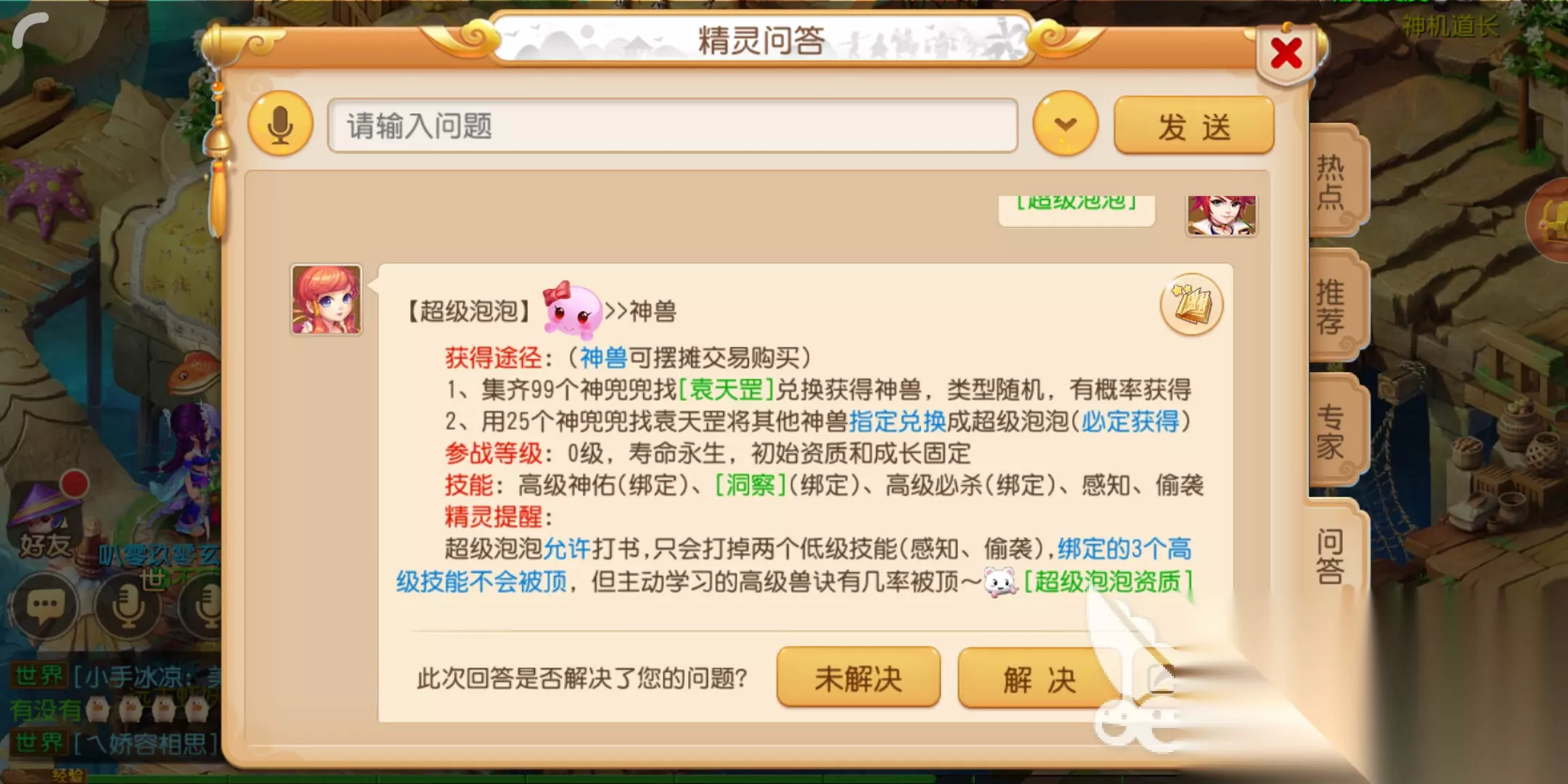 虽然摆地摊是获得超级泡泡的一种方式,但卖超级泡泡的人却很少。 我们可以收集99个神豆豆,然后去长安城找袁天罡NPC获取。但需要注意的是,获得的超级气泡类型是随机的,只能通过概率获得。