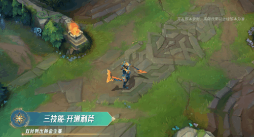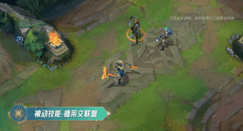 技能施放时,德莱文向前奔跑,脚下几何三角形能量不断涌动,移动时拖曳黄色和蓝色的菱形幻光尾迹,移速和攻速均获得提升。