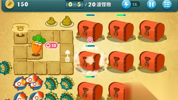 2、当然开局的方法有多种,玩家也可以在右侧放一个飞机,攻击左边的箱子,同时可以打开三个宝箱。 3、有金币后在上方放一个便便给怪物减速。 4、箱子炸开后把火箭升级到顶级,上方的便便也要升级。 5、然后攻击火箭旁边的宝箱,炸开后获得多重箭,把多重箭升级到顶级,然后攻击中间的宝箱。