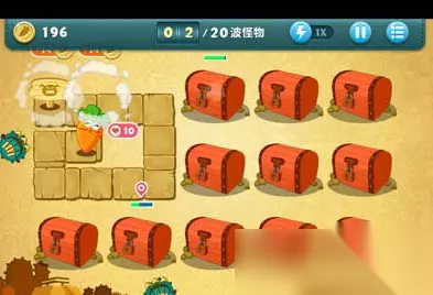 6、鱼刺炸出来后升到顶级,再把上方的宝箱炸开,获得飞机,同样升级到顶级。 7、接着在出口再放一些便便,用于给怪物减速,然后把下方的宝箱炸掉,获得船锚。 8、接下来继续炸右边的宝箱,慢慢在周围加飞机。 9、消灭怪物的同时,可以在怪物不多的时候把余下的箱子也炸掉。 10、然后在右边布满飞机。