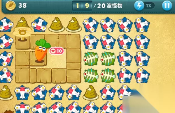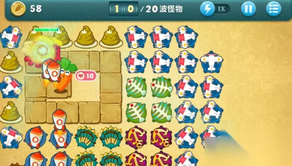 11、在攻击怪物的过程中,一定要慢,千万不要开加速。游戏过程中,发现怪物多的时候就暂停游戏,然后手动点击定位最前面的怪物,再继续游戏。暂停,定位,再继续,这就是诀窍。 12、一直到17波怪物,基本上都可以保证萝卜不被咬。17波后面的怪物比较强,可以暂停游戏,把火箭、多重箭、船锚都换成飞机。。 13、18波攻击的时候注意暂停定位,把前面的怪物先消灭掉。 14、20波怪物来的时候注意先把前面的小怪物全都消灭掉,这个时候大boss基本上已经走到中间,玩家可以暂停游戏,把顶部的便便卖掉换成飞机,集中攻击。最后金萝卜就可以拿到手了。