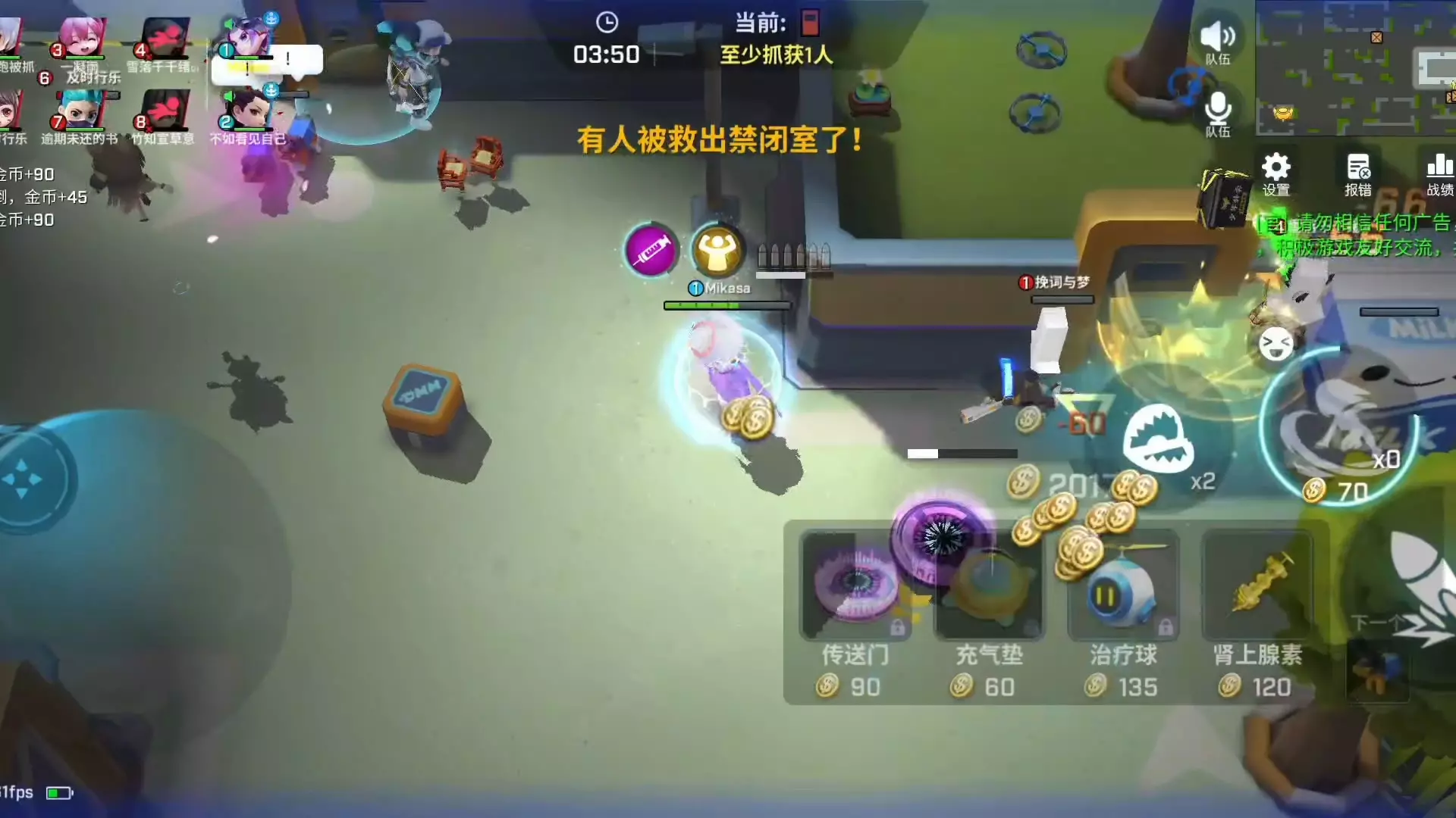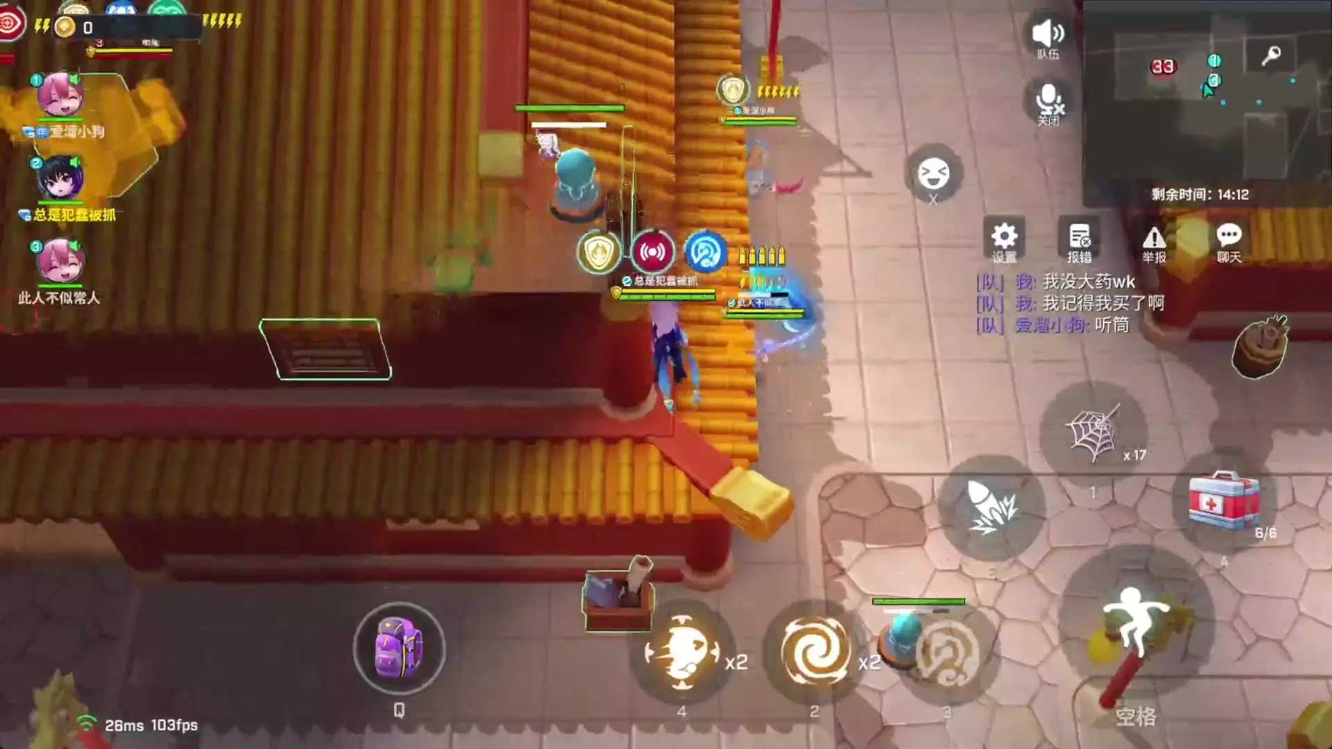 这是《逃跑吧!少年》的游戏对战帖,展示了玩家组队在百游坊地图的激烈对战过程,玩家使用无人机、蛛网道具等和队友配合,展开精彩的攻防操作,尽显对战实力。