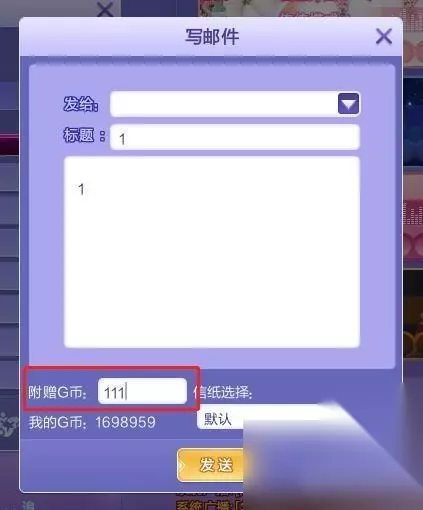 2、玩家在邮件中写上标题及内容,在下方【附赠G币】后边填写想要赠送的数量,然后点击发送,即可赠送成功。